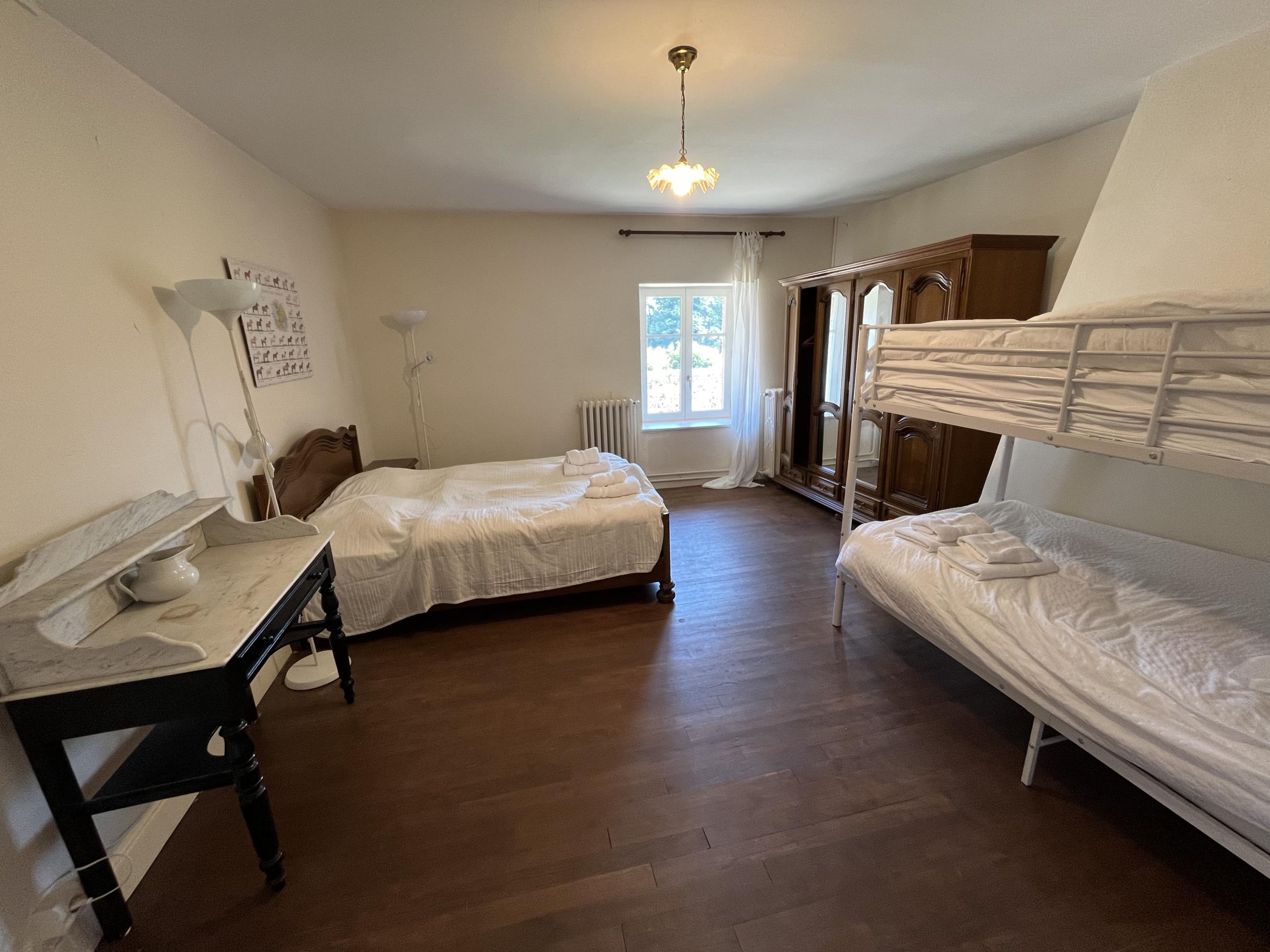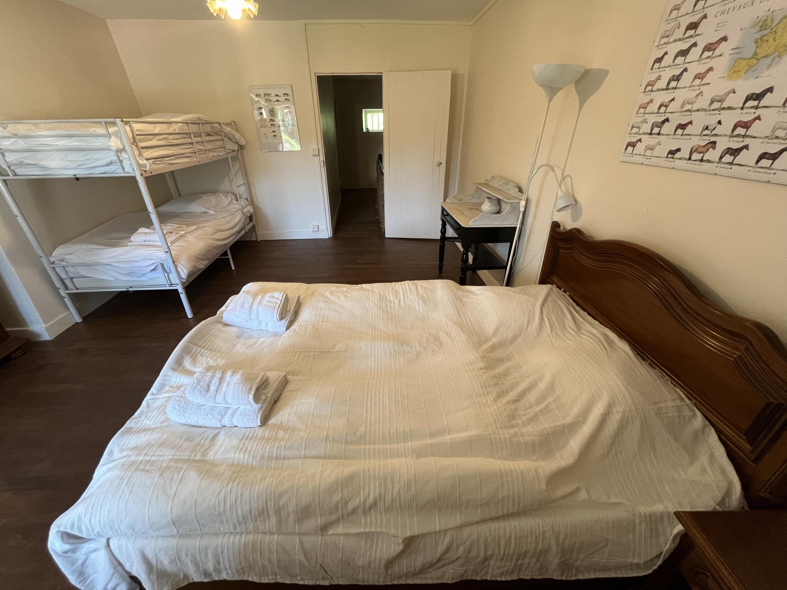 A quelques mètres des autres hébergements, notre maison de la ferme fait partie de l’ancien corps de ferme du domaine. Fraichement transformé et aménagée, elle permet désormais d’héberger jusqu’à 7 personnes. Elle dispose de deux chambres, d’un vaste salon et d’une grande cuisine. Dans une première chambre, un lit double et deux lits simples. La deuxième chambre est équipée de trois lits simples.
